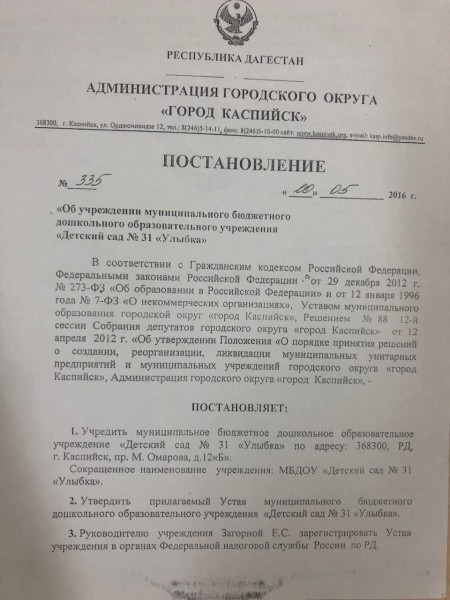 Муниципальное образование городской округ «город Каспийск» (Республика Дагестан, город Каспийск, улица Орджоникидзе, 12).