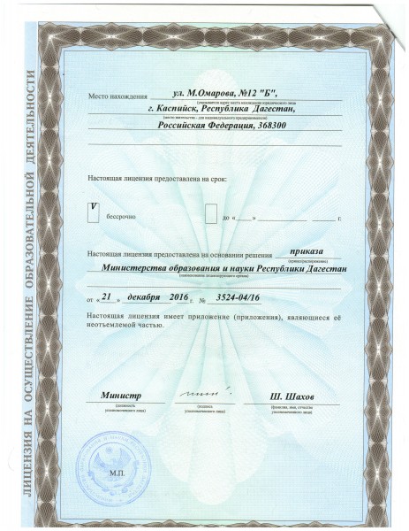 Адрес местонахождения образовательной организации* 368300 Республика Дагестан, г.Каспийск, пр-т М.Омарова 12 "Б"